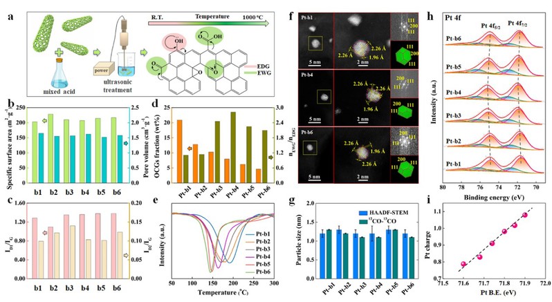 该工作以催化反应动力学为研究主线,采用球差电镜、12CO-13CO同位素切换以及扩展X射线吸收精细结构分析对Pt催化剂的几何结构进行了解析;采用X射线光电子能谱、X射线近边吸收光谱以及紫外光电子能谱分析对Pt催化剂的电子结构进行了解析。研究结果表明,混酸氧化后的碳纳米管置于惰性气氛下逐级升温焙烧,其表面负载铂的d带空穴数随着焙烧温度的升高呈现先增大后降低的趋势,而d带中心能量则表现出持续升高的趋势。催化性能结果表明,CO-TOX中铂的d带空穴数增大有利于抑制CO的中毒效应,而CO-PROX中铂的d带中心能量升高会延缓催化剂的中毒。