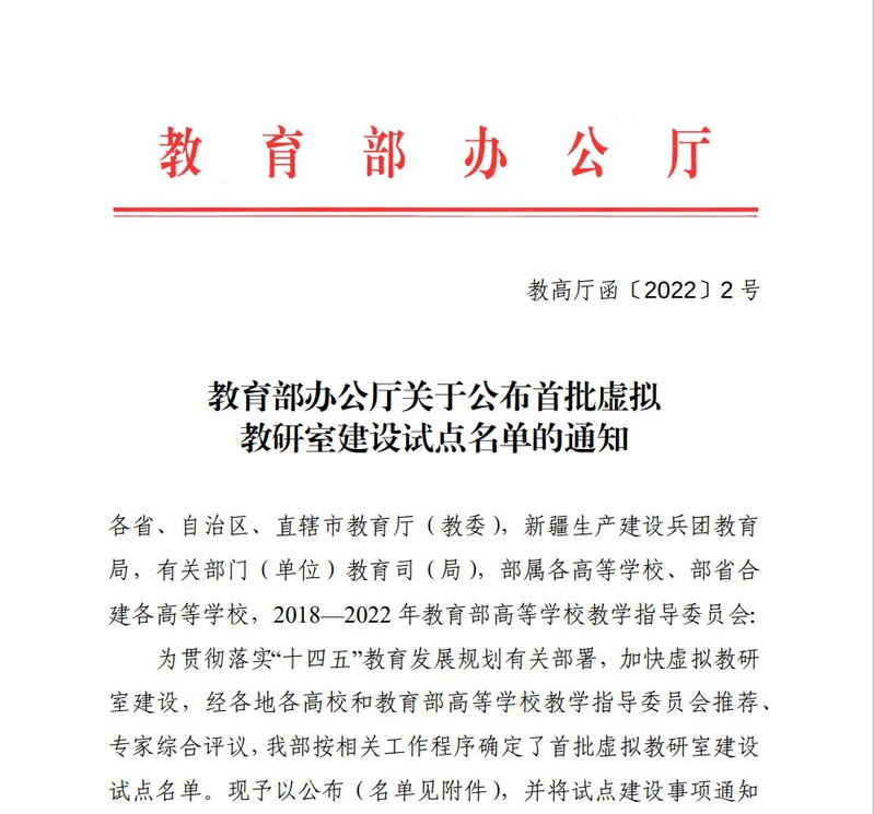 此次教育部首批共推荐439个虚拟教研室试点建设,希望通过3-5年的努力,建成全国高等教育虚拟教研室信息平台,建设一批理念先进、覆盖全面、功能完备的虚拟教研室,锻造一批高水平教学团队,培育一批教学研究与实践成果,全面提升教师教学能力。