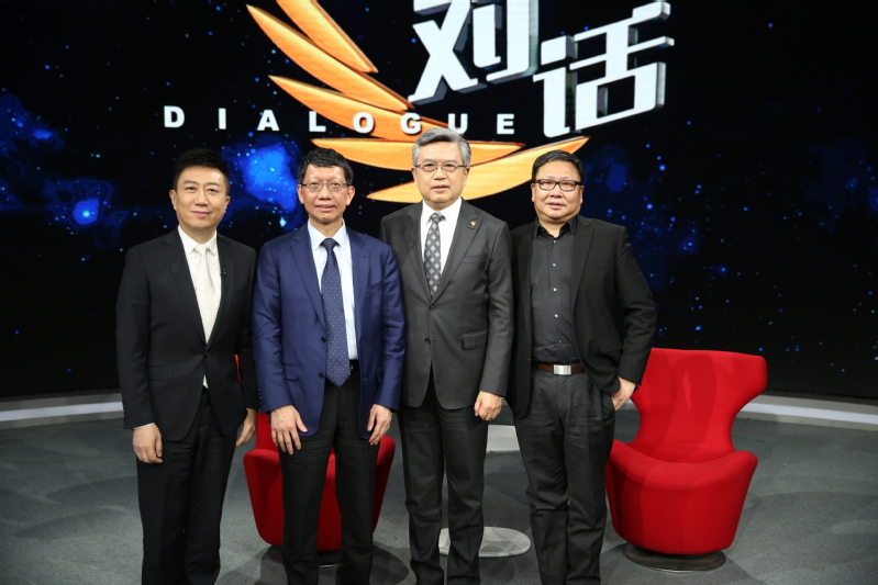 图片说明:节目录制现场,左一为《对话》栏目主持人陈伟鸿,左二为涂善东教授,左三为世界工程组织联合会主席龚克,右一为资深媒体人吴伯凡