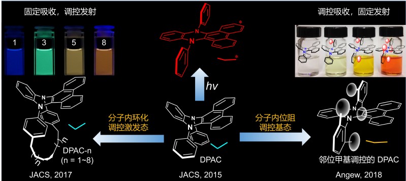 近年来,田禾院士团队在共轭分子发光机制领域做出了独特性和系统性的工作。该团队在研究二氢吩嗪类分子的空穴传输性能时,发现其具有极大的Stokes位移并表现出多重发射的光物理现象,由此提出振动诱导发光(VIE)机制,并通过极性、粘度及温度相关的稳态和超快分辨光谱和飞秒超快光谱研究验证了该理论(J. Am. Chem. Soc.,2015, 137, 8509)。为进一步揭示共轭结构与发光性质之间的相关性,利用“分子内环化调控激发态”的策略实现了对激发态分子骨架演变过程的精准追踪和精细调控(J. Am. Chem. Soc.,2017, 139, 1636);利用“邻位甲基位阻效应”实现了对基态分子构型的逐步精细调控,从而在基态模拟了激发态弯曲到平面化的构象演变过程(Angew. Chem. Int.Ed., 2018, 57, 9880)。在受邀综述中(Chem. Sci., 2020, 11, 7525),田禾院士团队进一步归纳总结出立体位阻和芳香性规则对二氢吩嗪的分子/电子结构和光物理性质起着决定性的作用。