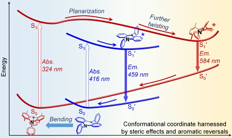 深入理解有机共轭分子的发光机制意义重大,这为分子结构的高效设计和应用性能的提升与拓展提供重要的理论指导。近日,我校化学与分子工程学院、费林加诺贝尔奖科学家联合研究中心田禾院士团队在振动诱导发光(VIE)机制的研究上再次取得重要进展,相关研究成果以“Interplay of StericEffects and Aromaticity Reversals to Expand the Structural/Electronic Responsesof Dihydrophenazines”为题发表在《美国化学会志》上。