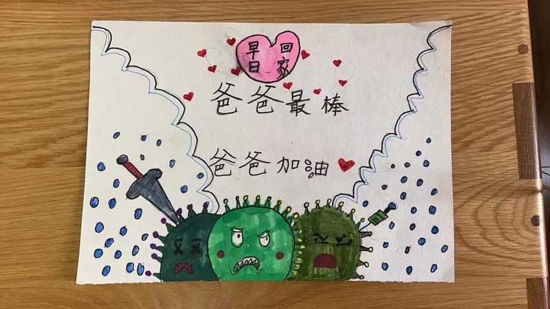 还在读小学的儿子天天打电话催他回家,他总是说:“好儿子,爸爸还在工作,等疫情过去了,爸爸马上就回家。”想念爸爸的孩子满怀思念,画了一幅画送给他:“爸爸最棒!爸爸加油!早日回家!”