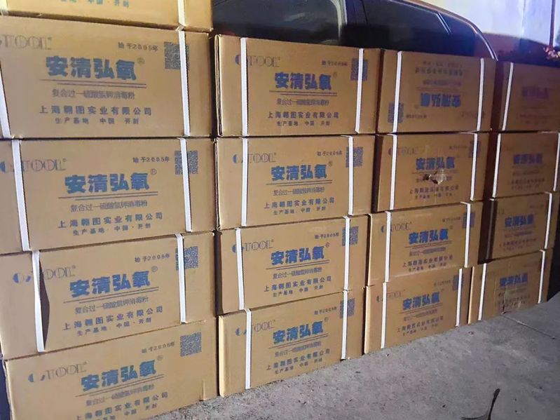 翱图公司李沛泓捐赠31箱消毒试剂和一箱喷壶。