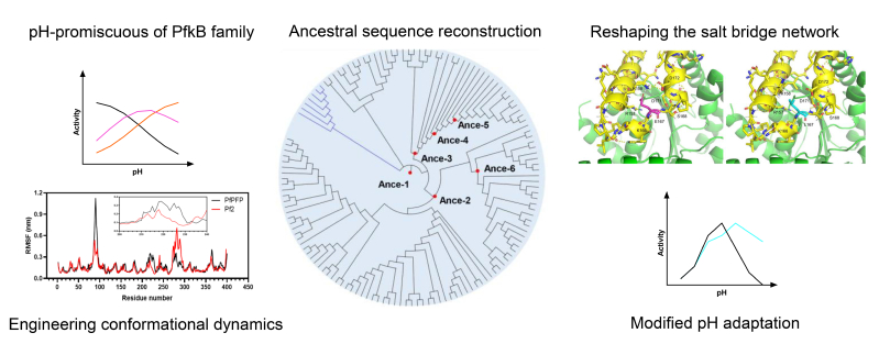 后续,研究团队利用祖先序列重建,推断并复活了PfkB家族的6个祖先酶。体外催化实验表明,祖先酶也具有pH混乱性。在序列比对具有不同遗传关系的PfkB家族成员时,发现了一段未被标注的氨基酸短序列,该序列在不同属来源酶之间差异很大,但在同一属中保守。结合结构和功能分析,猜测该区域很可能包含影响pH的残基。后续实验证实,在该区域理性设计突变即可显著改变酶的pH适应性甚至最适pH值。作者分析这是由于活性中心附近的盐桥网络改变所引起的,据此提出了一种有针对性的内源性微环境工程策略,通过靶向改变盐桥网络来改变酶的pH适应性。该工作首次从进化角度考虑酶的最适pH值的影响因素,为酶促pH适应性工程提供了有趣的新见解。
