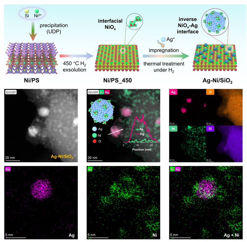 近日,我校化工学院催化反应工程团队在酯加氢反应的界面催化反向设计方面取得新进展,通过“反向NiOx–Ag界面构筑”策略,实现了酯分子与氢分子活化的空间解耦,解决了酯加氢反应中活性与选择性之间的相互制约难题。相关研究成果以“Inverse NiOx-Ag Interface to Decouple Reactant Activation for Ag–Ni/SiO2-Catalyzed Ester Hydrogenation”为题在Angewandte Chemie International Edition上在线发表。