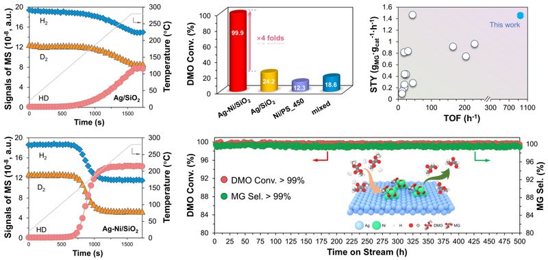 团队以草酸二甲酯(DMO)加氢制乙醇酸甲酯(MG)为研究体系,以Ni层状硅酸盐(Ni PS)为前驱体可控构筑富含NiOx的界面位点并引入Ag物种,经H2原位高温处理成功构建出NiOx分布于Ag表面的NiOx–Ag反向界面。球差电镜、原位X射线光电子能谱、同步辐射X射线吸收谱等表征测试从原子尺度揭示了富电子Ag和缺电子NiOx的界面位点结构。原位红外光谱与H2-D2同位素交换阐明了DMO在NiOx位点的吸附活化、H2在富电子Ag位点的解离与沿界面溢流的机制。密度泛函理论计算进一步表明,NiOx–Ag界面可有效降低C=O加氢和MG脱附的能垒。在DMO加氢制MG反应中,该催化剂在低氢酯比条件下表现出接近100%的DMO转化率和99%的MG选择性,并在500小时连续运行中保持稳定性能,显著优于目前已报道的催化剂。