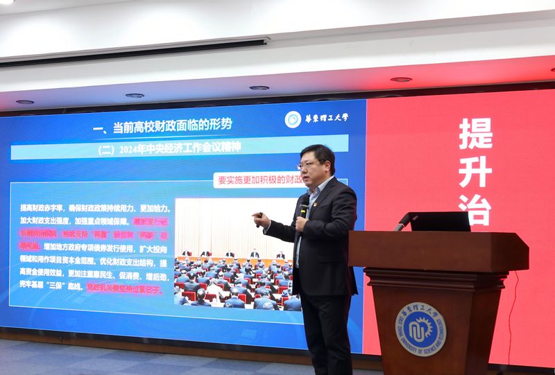 财务处党支部书记、处长李德强围绕“财经解码——学校财务治理思考与实践”作专题报告。报告立足当前学校财政工作形势任务,从问“渠”拓新、解“因”溯源、聚“流”强统、管“效”提质四个方面系统解读了我校财务治理工作的思路与举措。