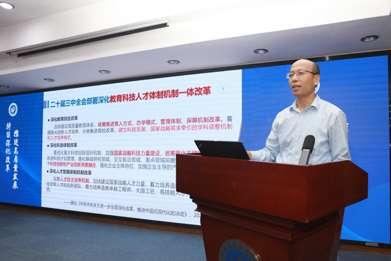 蒋传海在讲话中用“担当作为、有力有序”两个关键词总结了各部门、各学院的暑期工作,并对广大教职员工的辛勤工作表示感谢。会上,蒋传海从深入领会党的二十届三中全会的重大意义和习近平总书记在全会上的重要讲话精神,深入领会进一步全面深化改革的指导思想、总目标和重大原则、重大举措,深入领会提高党对进一步全面深化改革、推进中国式现代化领导水平的重要要求等方面,带领大家深入学习了党的二十届三中全会精神。他表示,高校作为教育、科技、人才的集中交汇点,要充分理解认识教育发展、科技创新、人才培养的发展逻辑和内在规律,“三位一体”推进改革,从体制机制上畅通教育、科技、人才的良性循环,不断激发内生动力和发展活力。